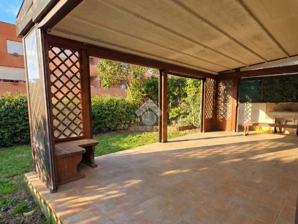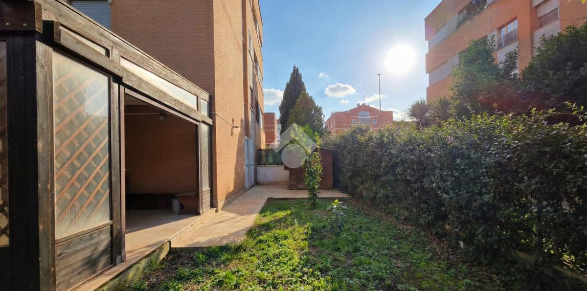 Tramite il soggiorno e la camera da letto è possibile accedere al giardino angolare di proprietà, caratterizzato da una parte pavimentata con casetta in legno per gli attrezzi e pergotenda, ideale per ospitare momenti conviviali e rilassanti.